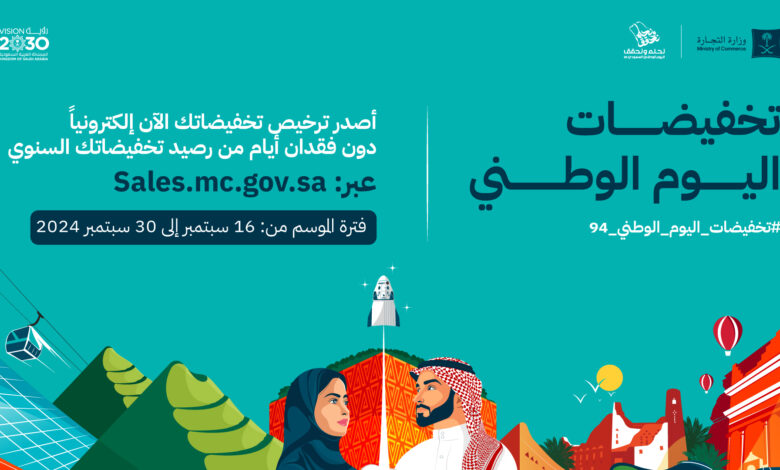 أعلنت وزارة التجارة عن إتاحة التقدم للحصول على تراخيص التخفيضات الموسمية لليوم الوطني السعودي 94، للمنشآت التجارية والمتاجر الإلكترونية، بشكل إلكتروني عبر: sales.mc.gov.sa، وتبدأ فترة التخفيضات للمستهلكين اعتباراً من 16 سبتمبر وحتى 30 سبتمبر 2024.