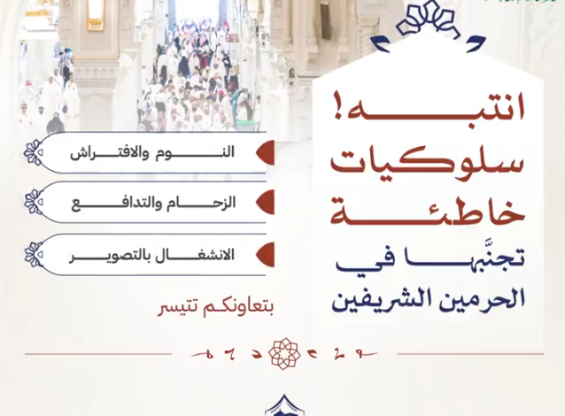 حثت وزارة الحج والعمرة، على تفادي السلوكيات الخاطئة في الحرم المكي الشريف.