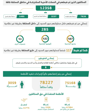 وأضافت أنه جرى ضبط 8 متورطين في نقل وإيواء وتشغيل مخالفي أنظمة الإقامة والعمل وأمن الحدود والتستر عليهم، فيما بلغ إجمالي من يتم إخضاعهم حاليًا لإجراءات تنفيذ الأنظمة أكثر من 78 ألف وافد مخالف، منهم أكثر من 75 ألف رجل، وأكثر من 3 آلاف امرأة.