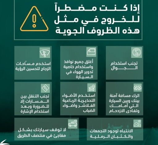 قدمت وزارة النقل عدة نصائح مهمة لتفادي وقوع حوادث على الطريق خلال قيادة المركبة خلال فترة العاصفة الغبارية التي تعرضت لها عدة مناطق بالمملكة.