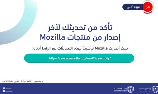 وأوضح المركز أن هذا التنبيه يأتي تماشياً مع التحديثات الجديدة التي أطلقتها شركة «Mozilla» لمعالجة ثغرات أمنية في منتجاتها، بهدف ضمان حماية بيانات المستخدمين وأنظمتهم من أي اختراقات محتملة.