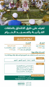 حددت الهيئة العامة للعناية بشئون الحرمين طرق الالتحاق بالحلقات القرآنية بالمسجد الحرام، حيث يتاح التسجيل في الحلقات القرآنية للرجال والنساء، وفقا للشروط التي حددتها الهيئة.