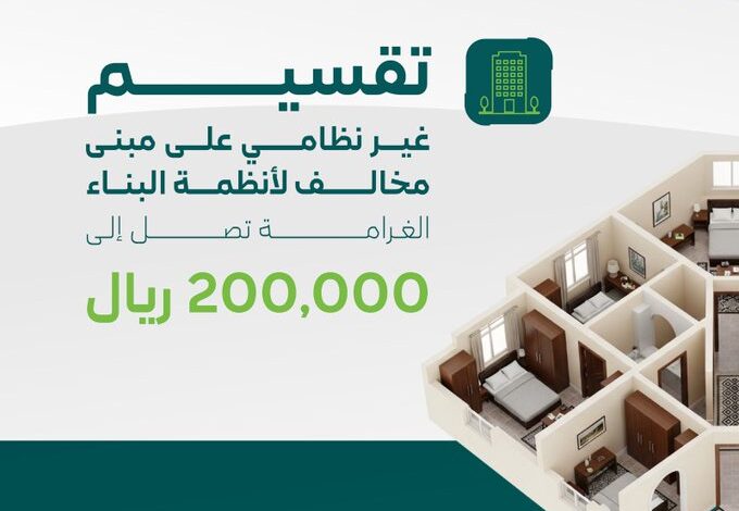 – تصل غرامة تقسيم غير نظامي على مبنى مخالف لأنظمة البناء، إلى 200 ألف ريال.