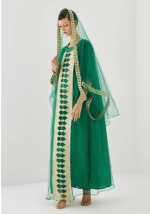 بدورها، استوحت المصممة تيما عابد تصاميمها من تموجات الكثبان الرملية، مقدّمة ثوباً أسود مطرزاً بالخرز النحاسي مع برقع شبكي مرصع، إضافة إلى تصميم بنفسجي من التفتا الحريري أطلقت عليه اسم “Grief”، مزين بأحجار كريستالية متلألئة. كما قدمت زياً تراثياً للعروس من الجاكار العاجي المطعم بالذهبي، مطرزاً بأحجار كريستالية متفاوتة، مع أكسسوار وجه يضفي هالة من الغموض والجاذبية.
