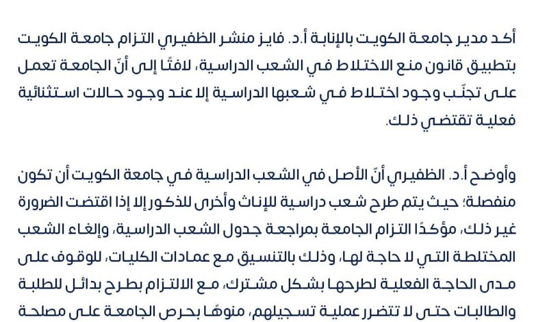 وأوضح أ.د. الظفيري أنّ الأصل في الشعب الدراسية في جامعة الكويت أن تكون منفصلة؛ حيث يتم طرح شعب دراسية للإناث وأخرى للذكور إلا إذا اقتضت الضرورة غير ذلك، مؤكدًا التزام الجامعة بمراجعة جدول الشعب الدراسية، وإلغاء الشعب المختلطة التي لا حاجة فعلية لها، وذلك بالتنسيق مع عمادات الكليات، للوقوف على مدى الحاجة الفعلية لطرحها بشكل مشترك، مع الالتزام بطرح بدائل للطلبة والطالبات حتى لا تتضرر عملية تسجيلهم، منوهًا بحرص الجامعة على مصلحة أبنائها الطلبة.