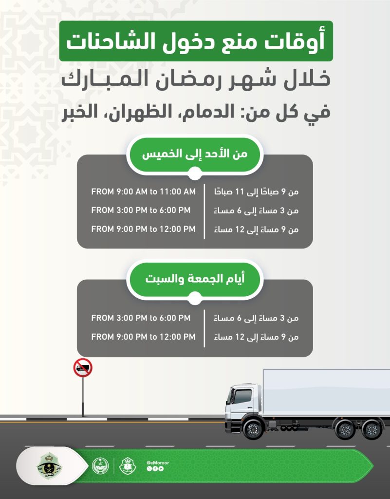 أعلنت الإدارة العامة للمرور عن تنظيم أوقات دخول الشاحنات في عدد من المدن والمحافظات خلال شهر رمضان المبارك، وذلك في إطار جهودها المستمرة لسلامة مستخدمي الطرق.