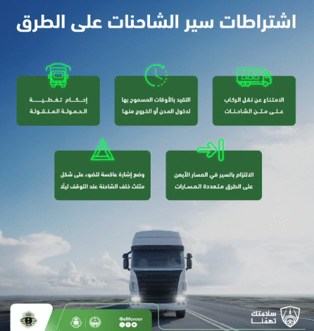 وأضافت الإدارة، عبر منصة (إكس)، أن هذه الاشتراطات تشمل امتناع الشاحنات عن نقل الركاب، والتقيد بأوقات دخول المدن والخروج منها وإحكام تغطية الحمولة المنقولة.
