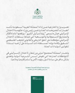 أعربت وزارة الخارجية السعودية عن إدانة المملكة بأشد العبارات التصريحات الصادرة عن رئيس وزراء حكومة الاحتلال الإسرائيلي، بنيامين نتيناهو، حيال ما يسمى “رؤية إسرائيل الكبرى”، ورفضها التام للأفكار والمشاريع الاستيطانية والتوسعية التي تتبناها سلطات الاحتلال الإسرائيلي، مؤكدةً الحق التاريخي والقانوني للشعب الفلسطيني الشقيق بإقامة دولته المستقلة ذات السيادة على أراضيه استنادًا للقوانين الدولية ذات الصلة.