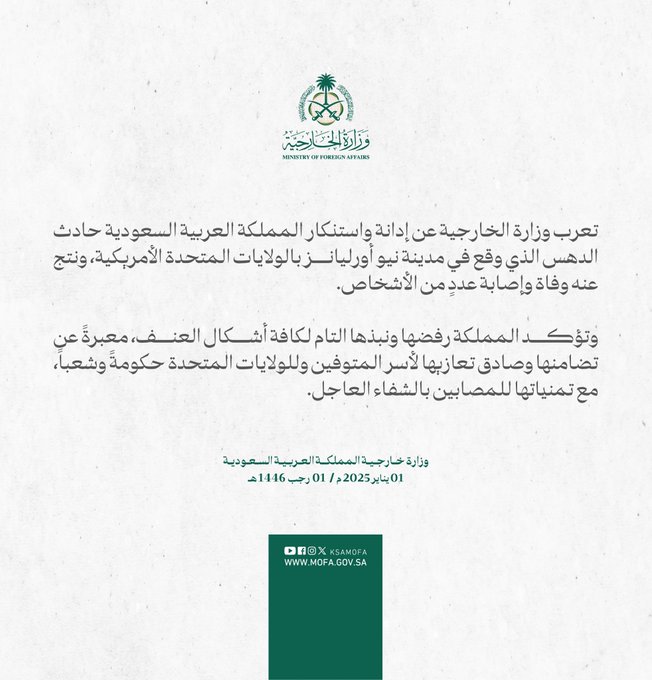 أعربت وزارة الخارجية عن إدانة واستنكار المملكة العربية السعودية حادث الدهس الذي وقع في مدينة نيو أورليانز بالولايات المتحدة الأمريكية، ونتج عنه وفاة وإصابة عددٍ من الأشخاص.