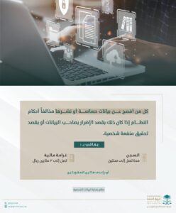 أوضحت النيابة العامة، أن كل من أفصح عن بيانات حساسة أو نشرها بقصد الإضرار بصاحب البيانات أو بقصد تحقيق منفعة شخصية ستكون عقوبته السجن مدة تصل سنتين، وغرامة مالية تصل 3 ملايين ريال.