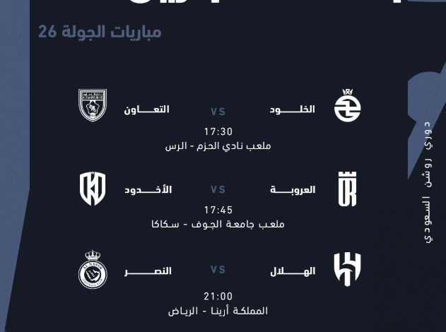 تنطلق منافسات الجولة الـ 26 من الدوري السعودي للمحترفين بعد فترة التوقف الدولية، إذ ستكون جولة استثنائية تجمع 3 ديربيات في جولة واحدة، بدايتها مساء اليوم الجمعة بديربي الرياض بين الهلال والنصر، فيما يلتقي السبت القادسية والاتفاق في ديربي الشرقية، وديربي الغربية بين الأهلي والاتحاد.