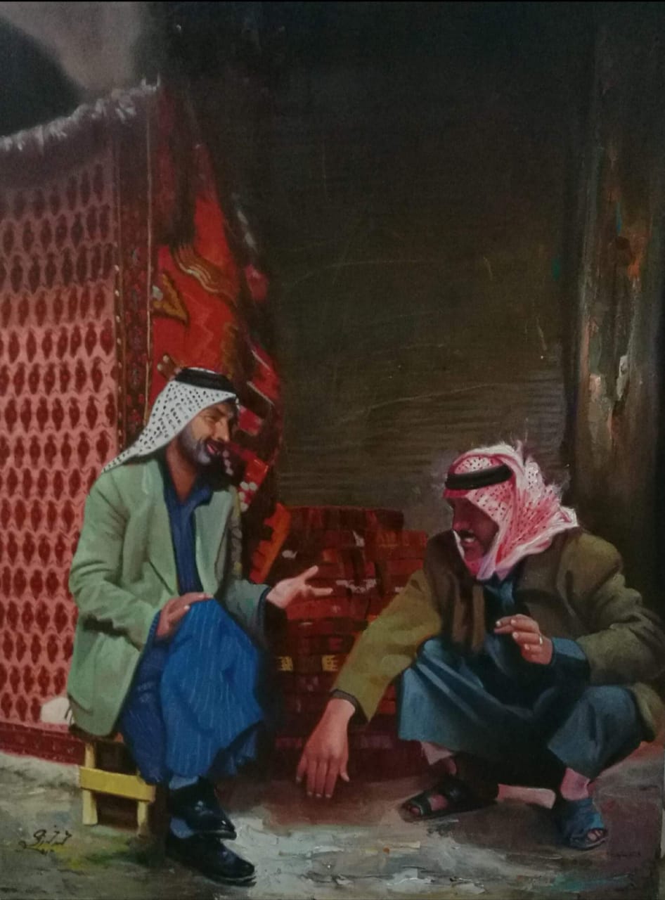 بائع السجاد رسم الفنان محمد الخزرجي من الأعمال الواقعية .