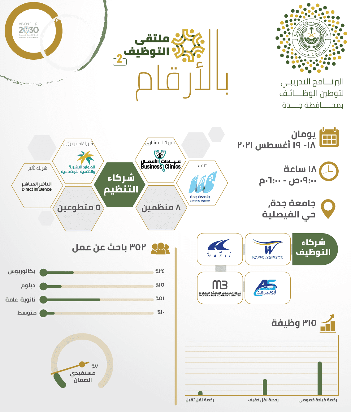 وشارك في تقديم الوظائف بثاني ملتقيات التوظيف شركة وارد للخدمات اللوجستية، شركة حافل للنقل، شركة ناصر أبوسرهد. شركة الحافلات الحديثة المحدودة.