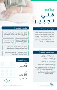 أعلنت الهيئة السعودية للتخصصات الصحية، عن بدء التقديم على الدفعة الأولى من برنامج «فني تجبير»، عبر بوابة الهيئة الإلكترونية، و يستمر حتى 25 مارس الجاري.