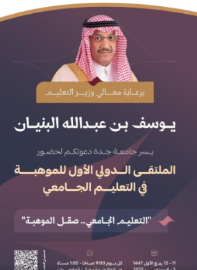 تحت رعاية معالي وزير التعليم الأستاذ يوسف بن عبد الله البنيان، تستعد جامعة جدة لإطلاق الملتقى الدولي الأول للموهبة في التعليم الجامعي يُعنى برعاية الموهبة والابتكار، خلال الفترة من ٣-٤ سبتمبر ٢٠٢٥م في مركز المؤتمرات بجامعة جدة.