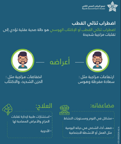 وفي هذا الصدد، لفت تجمع الرياض الصحي الثاني إلى أن أبرز أعراض اضطراب ثنائي القطب، تتمثّل في ارتفاعات مزاجية كالسعادة المفرطة والهوس، قد تصاحبها أو تعقبها انخفاضات مزاجية حادة مثل الحزن الشديد والاكتئاب.