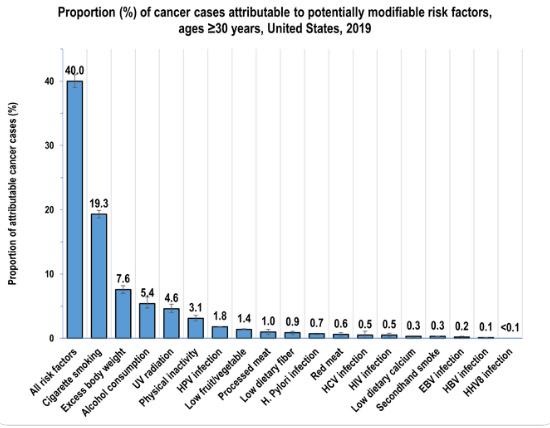 وأظهر تحليل البيانات أن التدخين له أعلى نسبة من حالات الإصابة بالسرطان بـ19.3% فيما ساهمت السجائر في 56% من جميع أنواع السرطان التي يمكن الوقاية منها لدى الرجال، و39.9% لدى النساء، وكانت زيادة الوزن ثاني أكبر عامل خطر 7.6%، يليها شرب الكحول 5.4%.