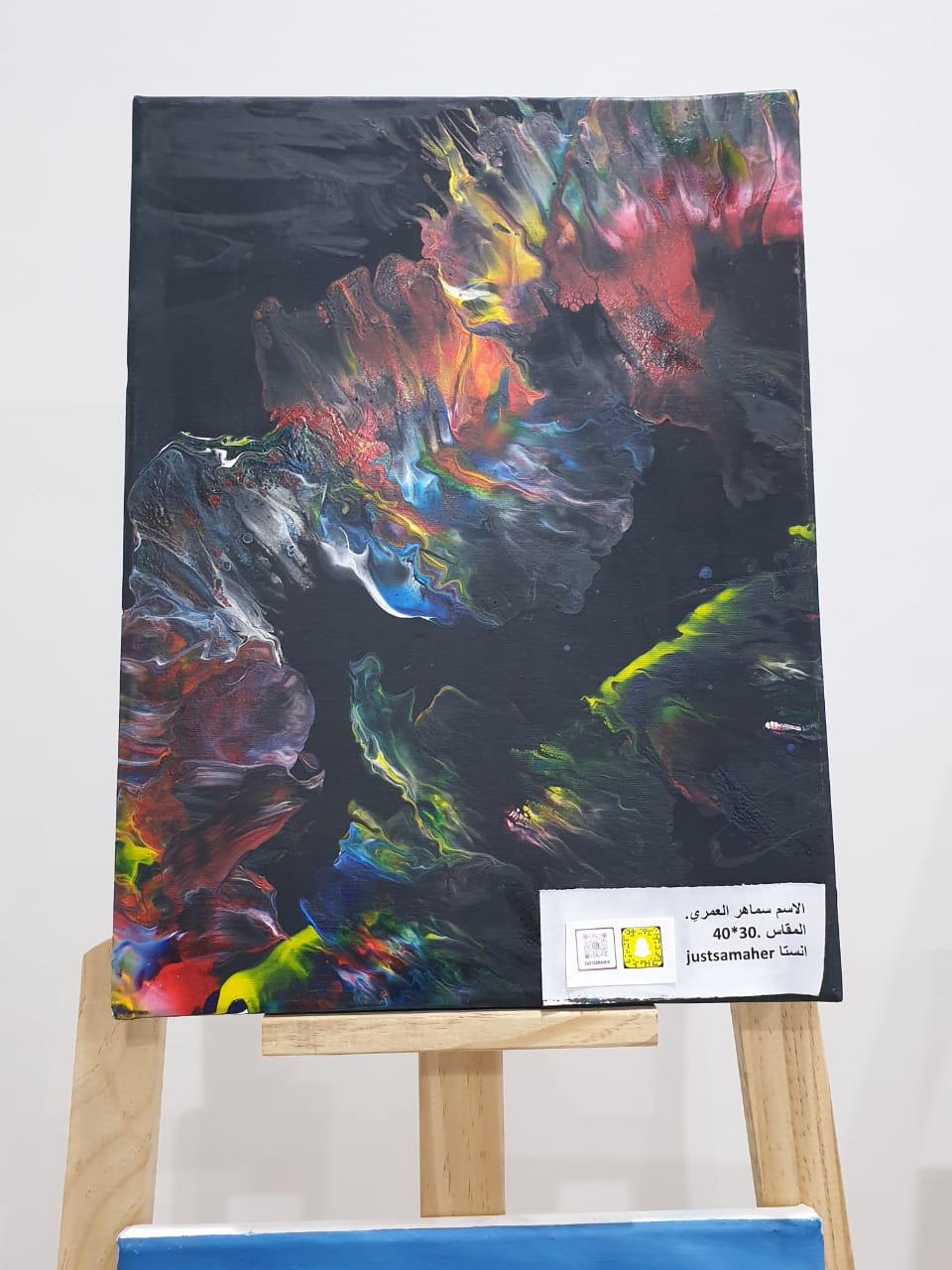 لوحة فنية من رسم الفنانة التشكيلية سماهر العُمري وهو من الفن التجريدي تنقنية سكب الأكريليك وهو أهداء لرئيس مجلس الأدارة بالغرفة التجارية بالمخواة .