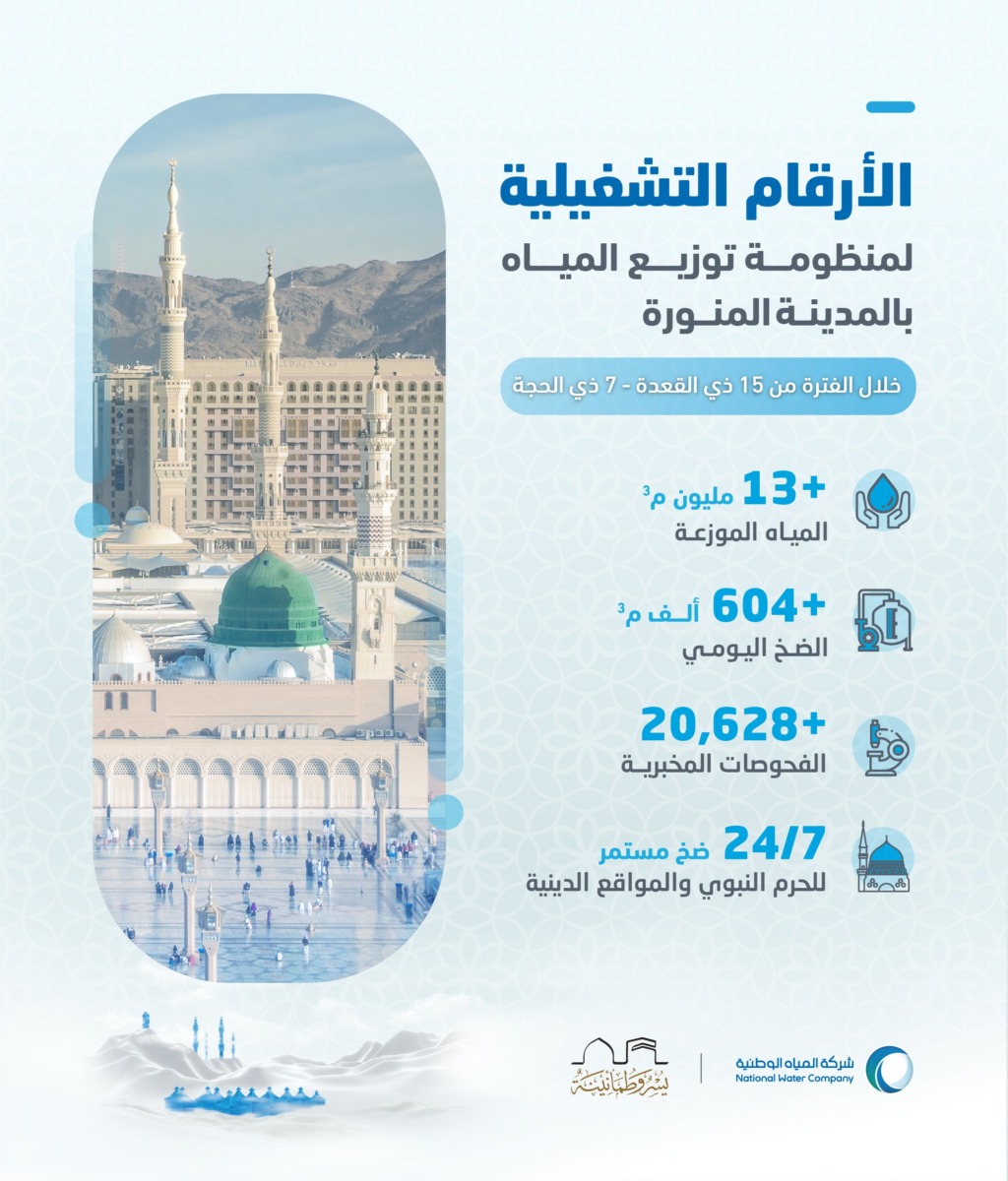 كما تواصل قطاعات منظومة المياه جهودها لضمان وموثوقية الإمداد على مدار الساعة وبشكل مستمر عبر فرقها وطواقمها وإمكاناتها في المشاعر المقدسة.