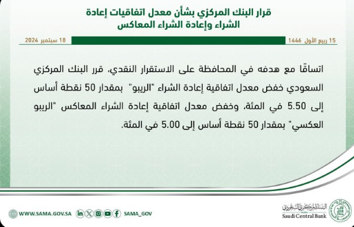 اتساقًا مع هدفه في المحافظة على الاستقرار النقدي، قرر البنك المركزي السعودي خفض معدل اتفاقية إعادة الشراء "الريبو" بمقدار 50 نقطة أساس إلى 5.50 في المئة، وخفض معدل اتفاقية إعادة الشراء المعاكس "الريبو العكسي" بمقدار 50 نقطة أساس إلى 5.00 في المئة.