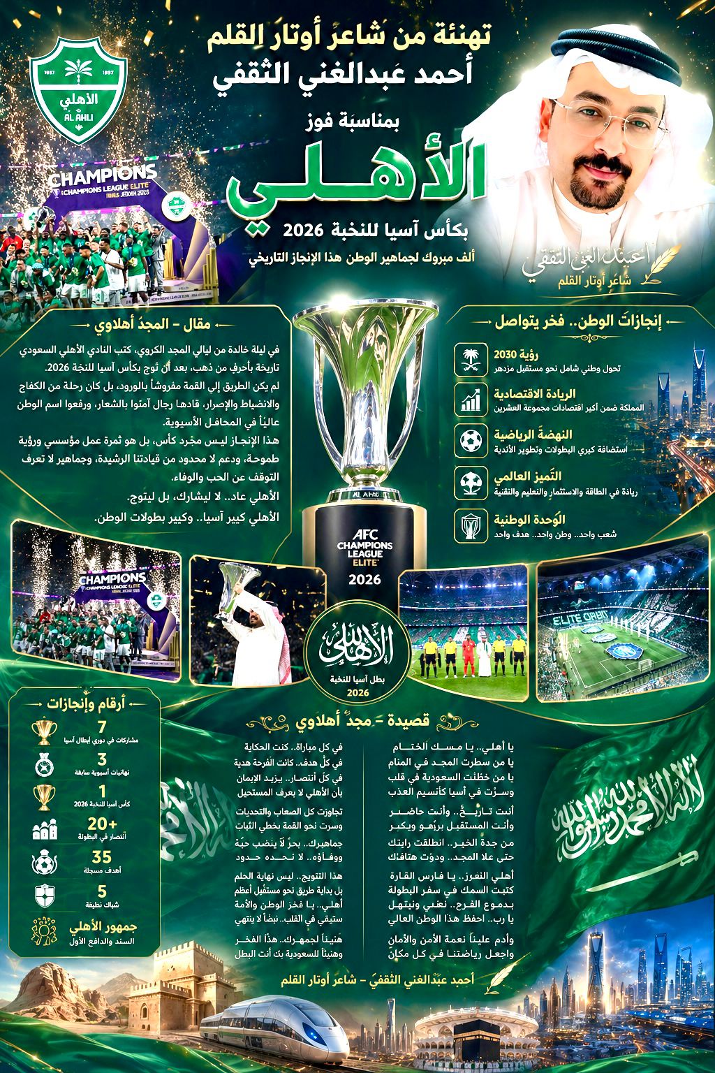 وأكد الدكتور أحمد عبدالغني الثقفي في هذه القصيدة أن فوز الأهلي ليس انتصارًا لنادٍ بعينه، بل هو امتداد لصورة مشرقة تعكس تطور الرياضة السعودية، وتكامل العمل المؤسسي، والدعم الكبير الذي تحظى به المنظومة الرياضية في المملكة، بما ينسجم مع مستهدفات رؤية المملكة 2030.