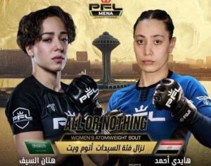 تستعد المقاتلة السعودية هتان السيف لخوض أول مواجهة احترافية في مسيرتها ضمن نهائيات دوري المقاتلين المحترفين لمنطقة الشرق الأوسط وشمال إفريقيا، أمام المقاتلة المصرية هايدي أحمد ، يوم 5 ديسمبر في مدينة الخبر.وأكدت السيف خلال مؤتمر صحفي عبر الزوم أن انتقالها إلى الاحتراف جاء بعد دراسة دقيقة ومعسكر تدريبي مكثف في تايلاند، مشيرة إلى أهمية دعم الجمهور السعودي في الحلبة.من جهتها، شددت هايدي أحمد على جاهزيتها التامة للمواجهة، مؤكدة أنها أعدت خطة واضحة بمعسكر تدريبي في مصر، ومستعدة لمواجهة بطلة المواي تاي على الحلبة.