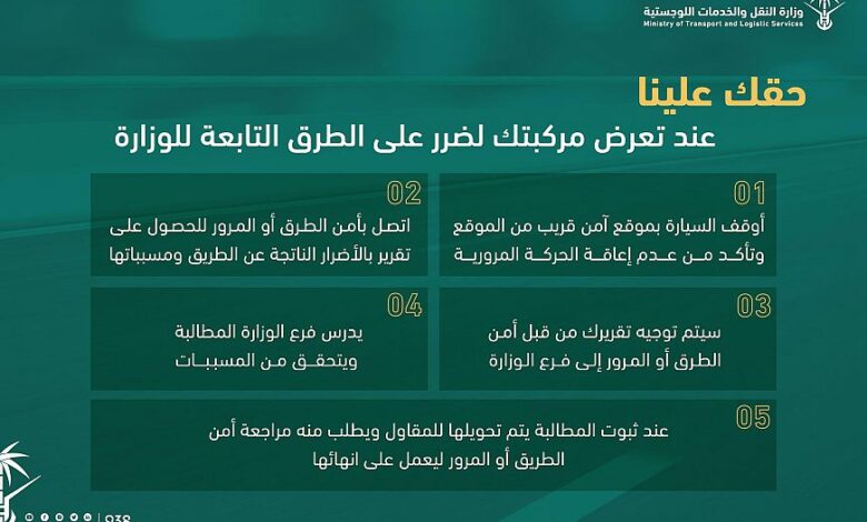 وأكدَتْ وزارةُ النقل والخِدْمَاتِ اللوجستية أنَّ لمستخدم الطريق حقًّا من خلال حفظ حقوقه في حال تَضَرَّرَتْ مركبتُهُ من الطريق؛وذلك عبر اتباع عدد من الخطوات التي تكفلُ لمستخدم الطريق حَقَّهُ؛حيث أَوْضَحَتْ الوزارةُ أنَّ الخطوةَ الأولى تكمنُ في إيقاف السيارة بموقع آمن قريب من موقع الضَّرَرِ مع أهمية التأكيد على عدم إعاقة الحركة المرورية، والاتصال على أمن الطرق أو الإدارة العامة للمرور حسب موقع الضَّرَرِ، للحصول على تقرير بالأضرار الناتجة عن الطريق ومسبِّباته، على أن يُرسلَ التقريرُ بعد ذلك من أمن الطرق أو الإدارة العامة للمرور إلى فرع وزارة النقل والخِدْمَاتِ اللوجستية في المنطقة، فيما يقومُ بعد ذلك فرعُ الوزارة بدراسة المطالبة والتحقُّقِ من المسببات، وعند ثبوت المطالبة يجري تحويلها للمقاول ويُطْلَبُ منه مراجعةُ أمن الطرق أو الإدارة العامة للمرور ليعمل على إنهائها.
