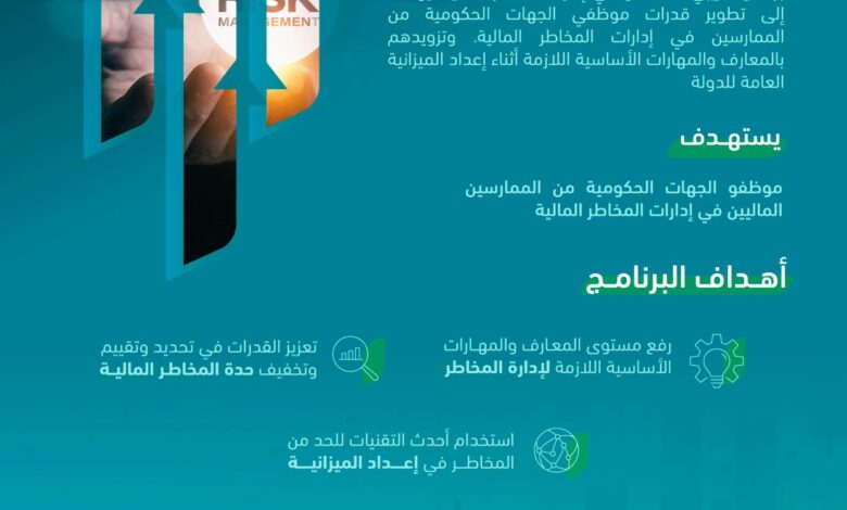 يذكر أن برنامج إدارة المخاطر المالية يُعد أحد مبادرات مركز المهارات المالية الهادفة إلى تطوير قدرات موظفي الجهات الحكومية من الممارسين في إدارات المخاطر المالية، وتزويدهم بالمعارف والمهارات الأساسية اللازمة أثناء إعداد الميزانية العامة للدولة .