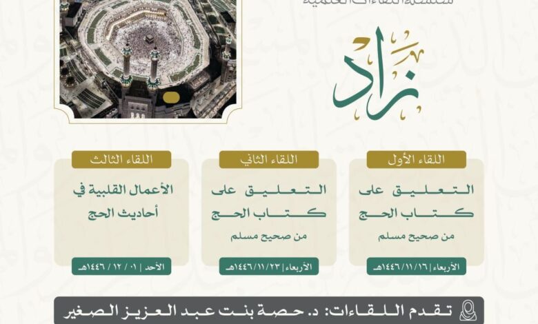 وتتضمن مبادرة “زاد” شرحًا لكتاب الحج من “صحيح الإمام مسلم” -رحمه الله-؛ وذلك عبر سلسلة دروس علمية منهجية مؤصلة، تهدف إلى نشر المنهج الإسلامي المعتدل، المبني على الفهم الصحيح لكتاب الله وسنة رسول الله ﷺ.