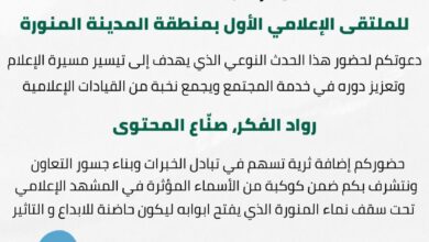 إدارة التحرير – المدينة المنورة تعتزم جمعية إعلاميو المدينة المنورة للإنتاج الإعلامي بالتعاون مع شركة الخبير القابضة إقامة أول ملتقى…